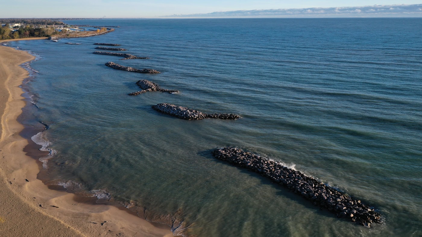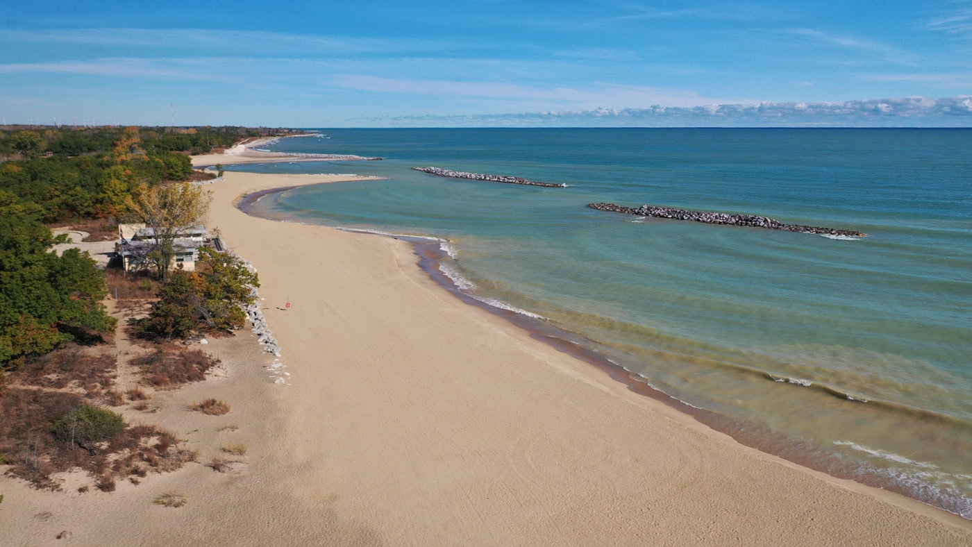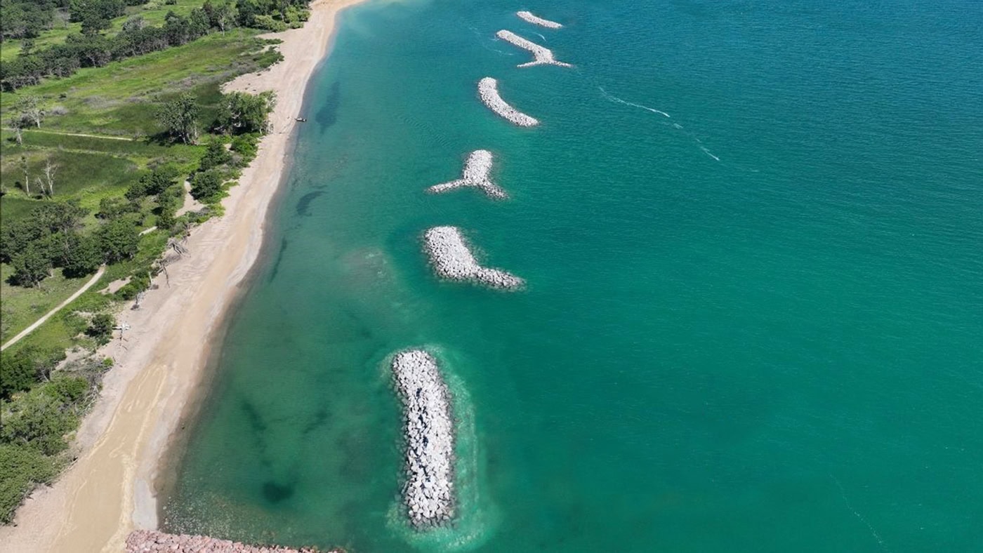 The Illinois Beach State Park Shoreline Stabilization project in Zion, Illinois was selected as a Best Restored Beach from The American Shore and Beach Preservation Association (ASBPA) in 2024. The project combined beach nourishment for a recreational beach and a coastal habitat restoration component protecting state park infrastructure and critical habitats. Due to a recent shoreline retreat in Illinois as high as 100 feet in one year, there was an urgent need to preserve the remaining coastal area. To create a shoreline stabilization strategy compatible with preserving the natural setting, Edgewater designed a full protection system including the placement of over 300,000 tons of stone to form a series of offshore detached breakwaters. The offshore structures are configured to embody both aquatic and avian habitat enhancing features for added eco-value.