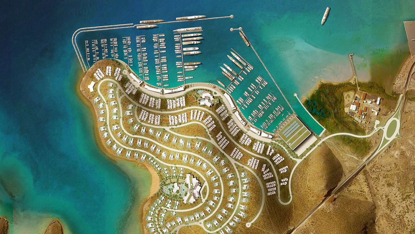 A luxury megayacht marina and resort located in a hurricane-safe harbor.